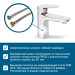 – сверхпрочные шланги гибкой подводки, изготовленные по технологии сшитого полиэтилена (PEX) и сроком службы до 50 лет, в оплетке из нержавеющей стали AISI 304.