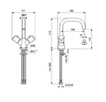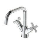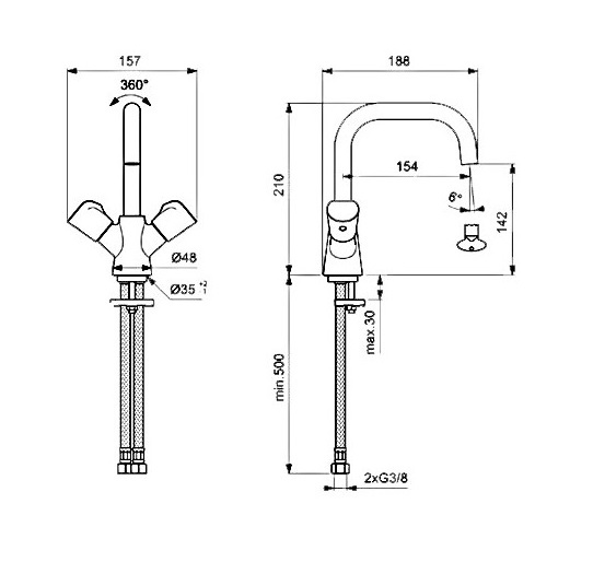 VIDIMA ART Смеситель для умывальника, система монтажа EASY-FIX (облегченный монтаж), трубчатый поворотный излив, длина излива 154 мм, угол поворота 360˚, аэратор Perlator, керамические кранбуксы производства Германии с поворотом 180˚, металлические рукоятки, индикатор холодной/горячей воды, гибкая подводка G3/8″, переходник на 1/2″ в комплекте, удлиненные шланги 550 мм