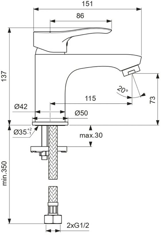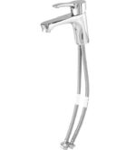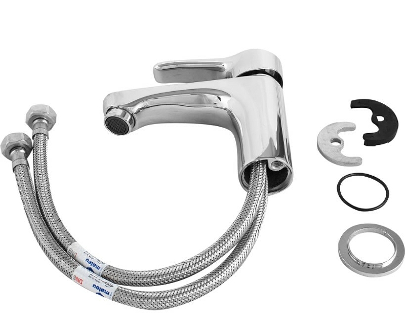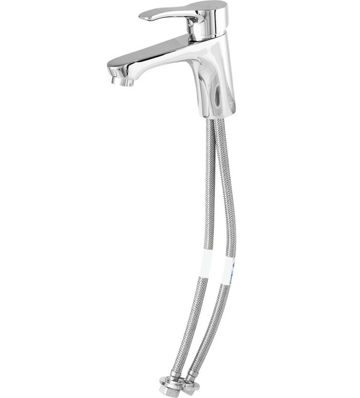 VIDIMA MELOY Смеситель для умывальника без донного клапана, система облегченного монтажа EasyFix, литой излив 115 мм, аэратор Perlator, керамический картридж 35 мм с функцией HWTC, металлическая рукоятка с индикаторами холодной/горячей воды, гибкая подводка 1/2″ стандартной длины 400 мм