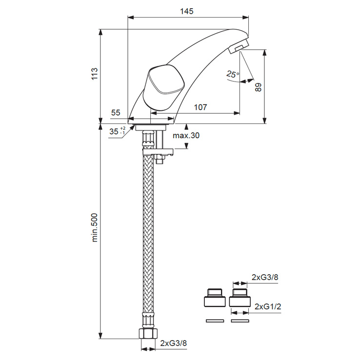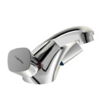 Снят с производства VIDIMA QUADRO Двурукоятковый смеситель для умывальника, литой корпус без отверстия под штангу донного клапана, система монтажа EASY-FIX (облегченный монтаж), литой излив 107 мм, аэратор Perlator, керамические кранбуксы с поворотом 180˚, металлические рукоятки, индикатор холодной/горячей воды, гибкая подводка G1/2″ 400 мм