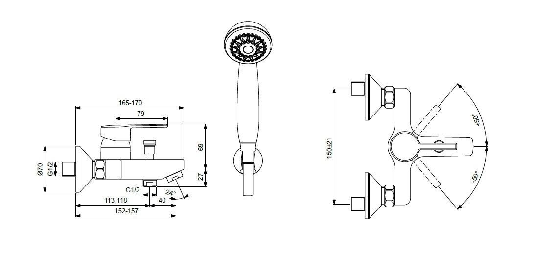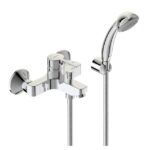 VIDIMA LOGIK Однорукоятковый смеситель для ванны/душа, монтаж на стандартных эксцентриках (в комплекте: эксцентрики, металлические отражатели, уплотнительные прокладки), литой излив 152-157 мм, аэратор Perlator, керамический картридж 35 мм, металлическая рукоятка с индикаторами горячей / холодной воды, ручное переключение ванна/душ, душевой гарнитур в комплекте (душевая лейка Ø70 мм, металлический шланг 1500 мм, держатель для лейки)