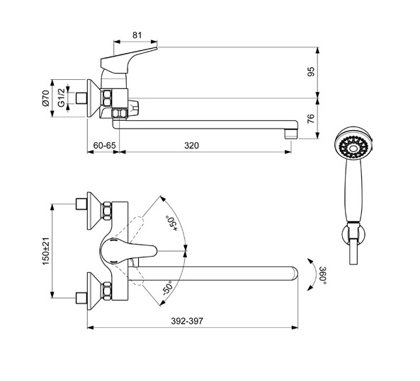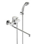 VIDIMA NEXT Настенный смеситель для ванны/душа, с керамическим переключателем, монтаж на стандартных эксцентриках (в комплекте: эксцентрики, металлические отражатели, уплотнительные прокладки), трубчатый поворотный излив, длина излива 320 мм; от стены 380 ÷ 385, угол поворота 360˚аэратор Perlator, керамический картридж IS 40 мм, с функцией HWTC (ограничение максимальной температуры горячей воды), без функции CLICK, металлическая рукоятка с индикаторами горячей / холодной воды, ручной керамический переключатель, с душевым гарнитуром (душевая лейка Ø70 мм, металлический шланг 1500 мм, держатель для лейки)