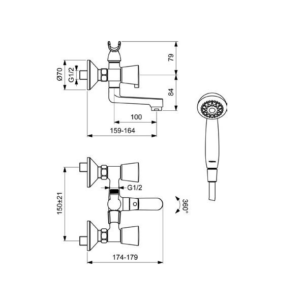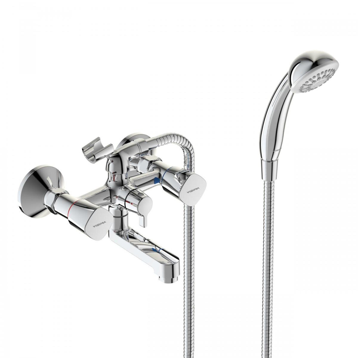 VIDIMA QUADRO Смеситель для ванны/душа, с керамическим переключателем, монтаж на стандартных эксцентриках (в комплекте: эксцентрики, металлические отражатели, уплотнительные прокладки), литой поворотный излив, длина излива 100 мм, от стены 159 ÷ 164, аэратор CASCADE, керамические кранбуксы производства Германии с поворотом 180˚, металлические рукоятки, индикатор холодной/горячей воды, переключение ванна/душ – ручной керамический переключатель, душевой гарнитур в комплекте (душевая лейка Ø70 мм, металлический шланг 1500 мм, держатель для лейки)
