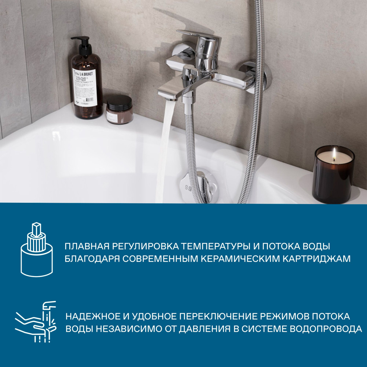 – поворортный керамический переключатель ванна/душ: надежное и удобное переключение режимов потока воды независимо от давления в системе водопровода;