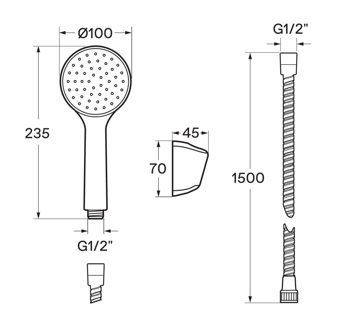 – душевой набор в комплекте: лейка ø100 мм; шланг 1.5 м, настенный держатель;