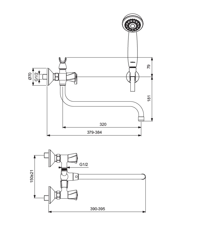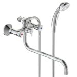 VIDIMA LIFE Смеситель для ванны/душа с керамическим переключателем, монтаж на стандартных эксцентриках (в комплекте: эксцентрики, металлические отражатели, уплотнительные прокладки), трубчатый поворотный излив 320 мм, от стены 379 ÷ 384, угол поворота 360˚, аэратор Perlator, керамические кранбуксы с поворотом 180˚, пластиковые рукоятки, индикатор холодной/горячей воды, ручное переключение ванна/душ, душевой гарнитур в комплекте (душевая лейка Ø70 мм, металлический шланг 1500 мм, держатель для лейки)