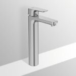 CERAPLAN III SLIM Vessel Однорукоятковый смеситель для умывальника с металлическим донным клапаном, керамический картридж FirmaFlow 35 мм с функцией HWTC (ограничение максимальной температуры горячей воды), гибкая подводка G3/8″, система монтажа EASY-FIX (облегченный монтаж), литой излив, длина излива 141 мм, высота 245 мм, аэратор Perlator, класс А, металлическая рукоятка с индикаторами горячей / холодной воды, металлический донный клапан