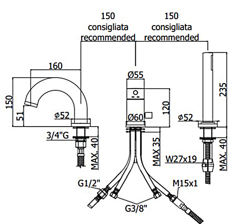 Смеситель на борт ванны на 3 отв. С увеличенным расходом MAX FLOW, С душем MASTER, с комплеком подключений, черный матовый