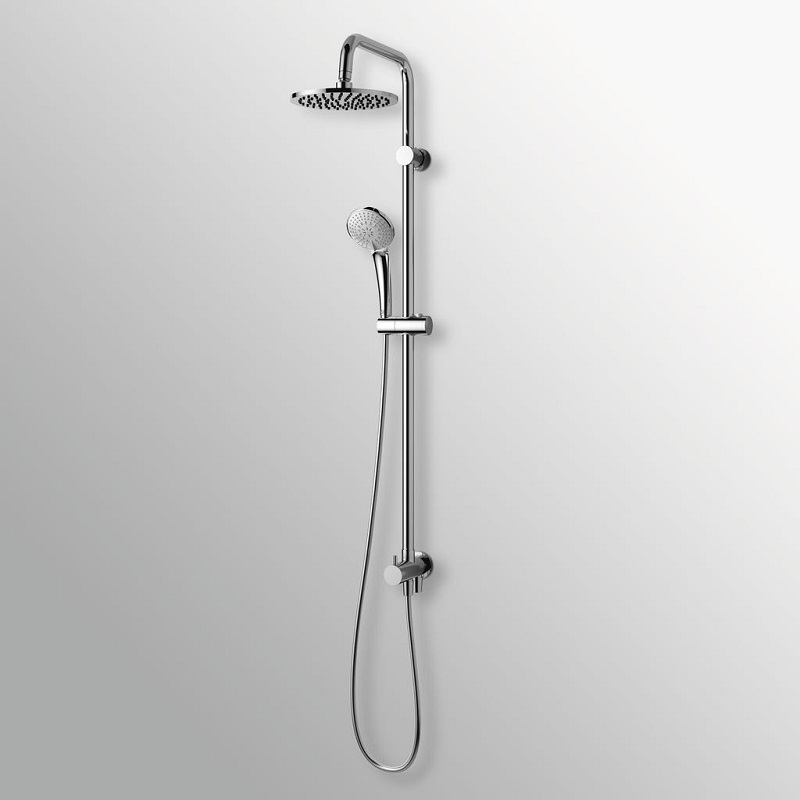 IDEALRAIN SOFT Душевая система для установки с настенным смесителем. 3-функциональная душевая лейка Ø100 мм (B9403AA), ограничение потока 8 л/мин., пластик; верхний душ Ø200 мм (латунь), ограничение потока 12 л/мин.; душевая труба Ø25 мм для верхнего душа (латунь), ручное переключение, пластиковый слайдер, металлические крепления к стене, шланг для душа IdealFlex 1750 мм (пластик). Смеситель заказывается дополнительно.