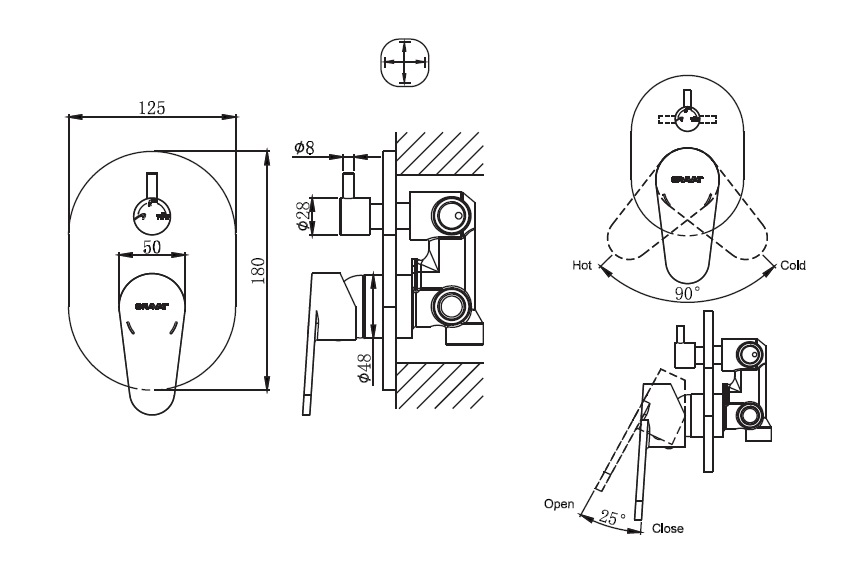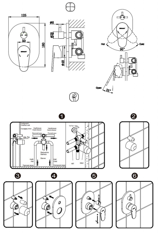 Смеситель встраиваемый в стену 3-функц: верхний душ, ручной душ, излив (латунное тело в комплекте)