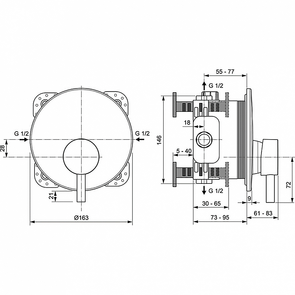 A7388XG CERALINE Встраиваемый смеситель для душа, комплект №2 (функциональный комплект и накладка для настенного монтажа), картридж 47 мм функцией HWTC (ограничение максимальной температуры горячей воды), с функцией CLICK (ограничение потока воды), металлическая рукоятка с индикаторами горячей / холодной воды, металлическая накладка, для монтажа с комплектом EASY-BOX A1000NU (заказывается дополнительно)