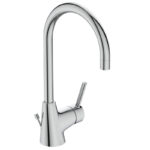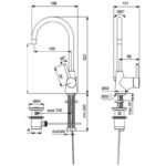 CERALINE Однорукоятковый смеситель для умывальника с ручкой сбоку, трубчатый излив, картридж 35 мм с функцией HWTC (ограничение максимальной температуры горячей воды) (ВНИМАНИЕ – с марта 2021 замена на 28mm FirmaFlow), гибкая подводка G3/8″, система монтажа EASY-FIX (облегченный монтаж), аэратор Cashe с ограничением потока 5 л/мин., металлическая рукоятка с индикаторами горячей / холодной воды, металлический донный клапан