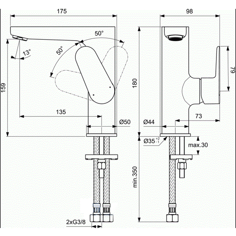 CERAFINE O Однорукоятковый смеситель для умывальника без донного клапана, рукоятка сбоку, система облегченного монтажа EasyFix®, литой излив, длина излива 136 мм, высота 155 мм, аэратор PCA с ограничением потока 5 л/мин., керамический картридж 28 мм FirmaFlow, с функцией HWTC (ограничение максимальной температуры горячей воды), металлическая рукоятка, гибкая подводка G3/8″