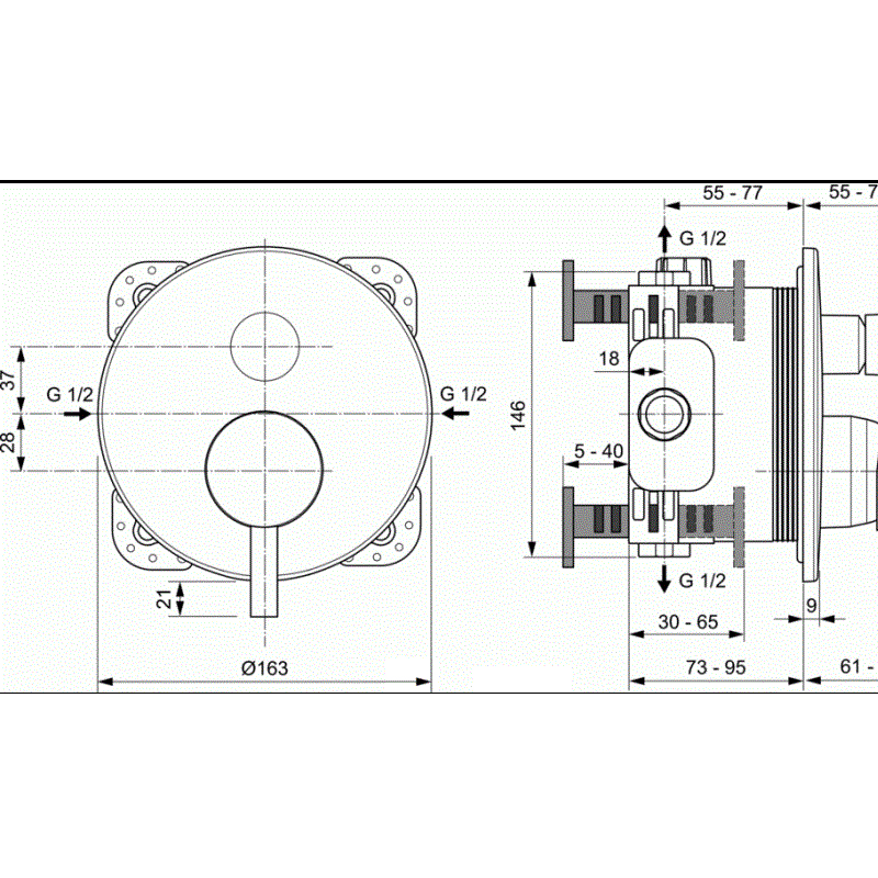 CERALINE Встраиваемый смеситель для ванны/душа, комплект №2 (функциональный комплект и накладка для настенного монтажа), картридж 47 мм функцией HWTC (ограничение максимальной температуры горячей воды), с функцией CLICK (ограничение потока воды), металлическая рукоятка с индикаторами горячей / холодной воды, металлическая накладка, для монтажа с комплектом EASY-BOX A1000NU (заказывается дополнительно), автоматическое переключение ванна/душ