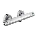 Ceratherm T50 Настенный термостатический смеситель для душа, монтаж на стандартных эксцентриках, термостатический картридж IS, новая технология, затворы на керамических дисках G1/2 180˚, технология “Cool body” (“Холодный корпус”), металлические рукоятки с ограничителями температуры (40ºC) и потока воды (50%), встроенный обратный клапан