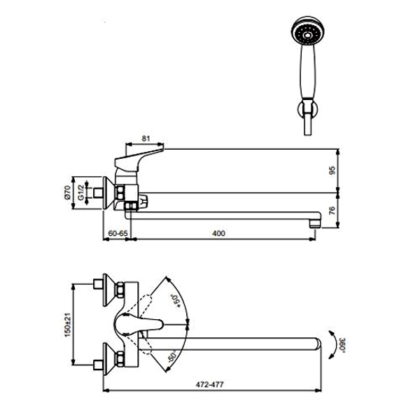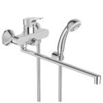 VIDIMA NEXT Смеситель для ванны/душа, с керамическим переключателем, монтаж на стандартных эксцентриках (в комплекте: эксцентрики, металлические отражатели, уплотнительные прокладки), трубчатый поворотный излив 400 мм, аэратор Perlator, керамический картридж IS 40 мм, с функцией HWTC (ограничение максимальной температуры горячей воды), без функции CLICK, ручное переключение ванна/душ, душевой гарнитур в комплекте (душевая лейка Ø70 мм, металлический шланг 1500 мм, держатель для лейки)