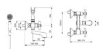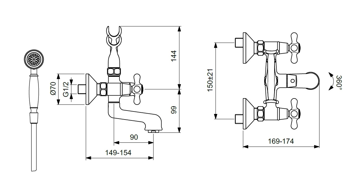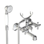 RETRO Смеситель для ванны/душа, с керамическим переключателем, монтаж на стандартных эксцентриках (в комплекте: эксцентрики, металлические отражатели, уплотнительные прокладки), литой поворотный излив, длина излива 90 мм; от стены 149 ÷ 154, аэратор Perlator, керамические кранбуксы производства Германии с поворотом 180˚, металлические рукоятки, индикатор холодной/горячей воды, переключение ванна/душ – ручной керамический переключатель, душевой гарнитур в комплекте (душевая лейка RETRO Ø55 мм, металлический шланг 1500 мм, держатель для лейки)