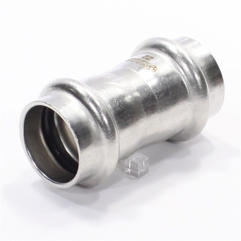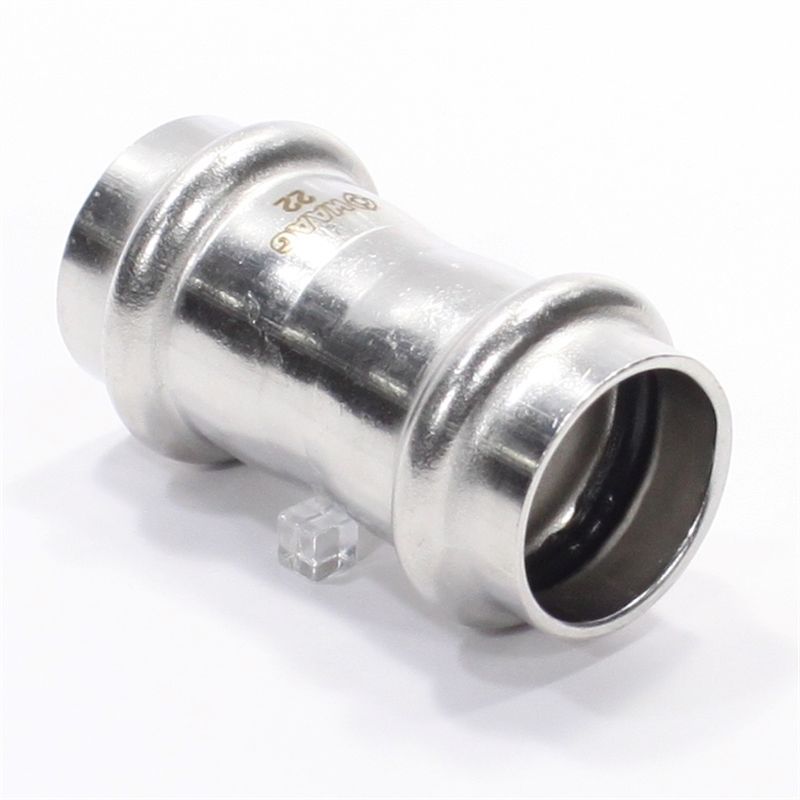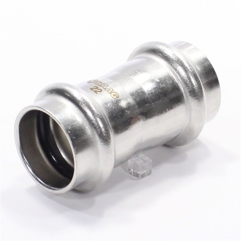 Муфта изготовлена из стали AISI 304. Материал уплотнительных колец – эластомер EPDM. Уплотнение EPDM, установленное в пресс-фитинг WAAG оснащено уникальным индикатором прессования, которое показывает неопрессованное соединение. Такое соединение будет не герметично (протекать) под давлением от 0,1 до 6,0 бар, поэтому при установке необходимо убедиться, что труба полностью вставлена в фитинг. Достоинством бесштуцерных соединителей является малый коэффициент местного сопротивления (сужение канала практически отсутствует). Фитинг рассчитан на обжатие с помощью пресс-инструмента V-профиля.