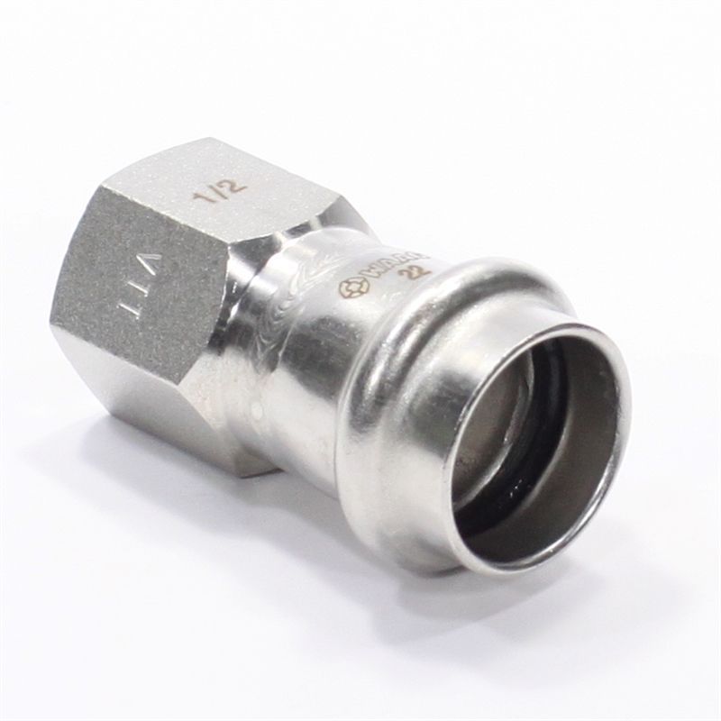 Концевой переходник с внутренней резьбой изготовлен из стали AISI 304. Материал уплотнения – эластомер EPDM. Уплотнение EPDM, установленное в пресс-фитинг WAAG оснащено уникальным индикатором прессования, которое показывает неопрессованное соединение. Такое соединение будет не герметично (протекать) под давлением от 0,1 до 6,0 бар, поэтому при установке необходимо убедиться, что труба полностью вставлена в фитинг.