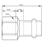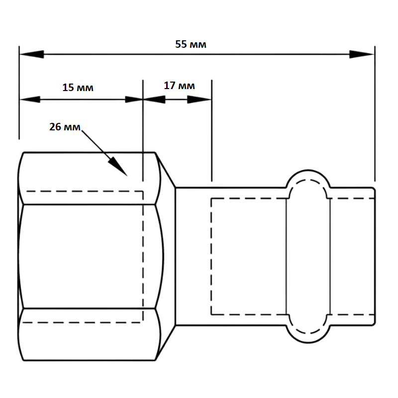 Пресс-соединение – бесштуцерное. Обжатие производится с помощью пресс-инструмента V-профиля. Шестигранный – под гаечный ключ – участок корпуса облегчает монтаж резьбового соединения.