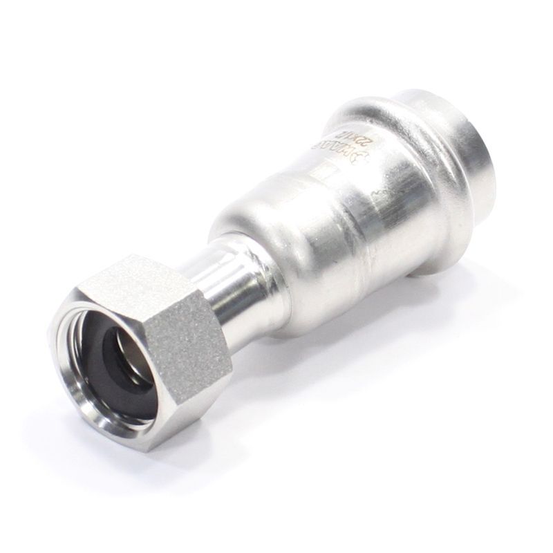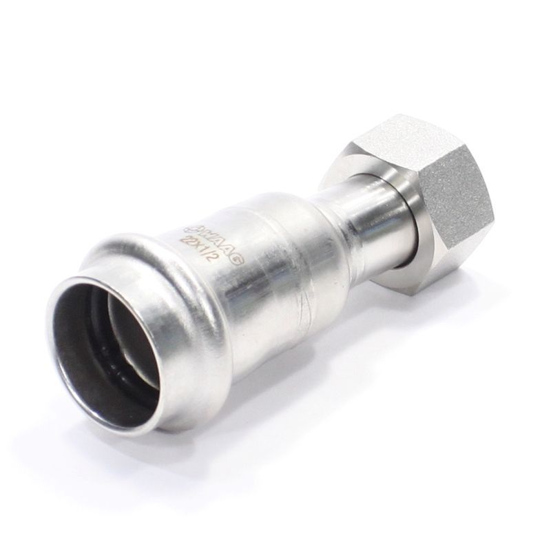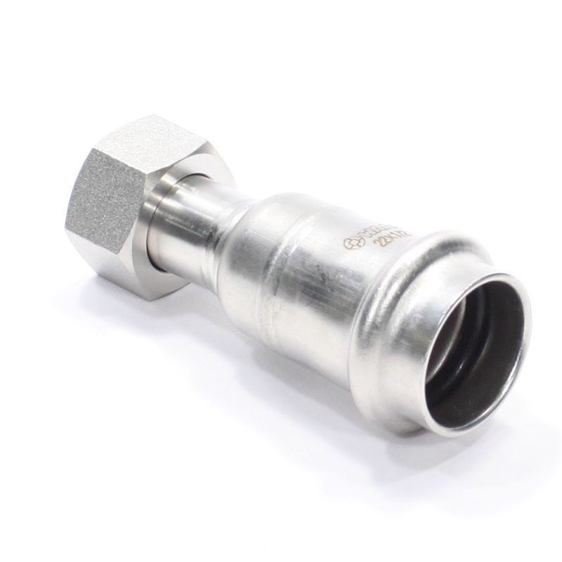 Пресс-фитинг из нержавеющей стали с накидной гайкой обеспечивает соединение тонкостенной стальной трубы c элементом системы, имеющим наружную резьбу. Область применения – трубопроводы водоснабжения, отопления, иные инженерные и технологические установки с рабочей температурой до 120 °С и давлением до 16 бар.