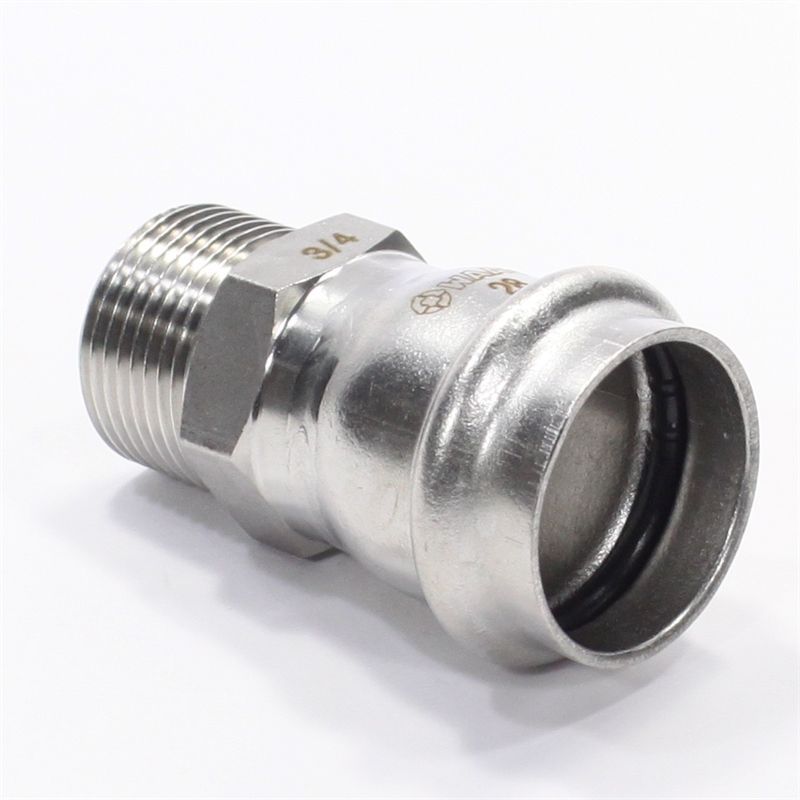 Концевой переходник с наружной резьбой изготовлен из стали AISI 304. Материал уплотнения – эластомер EPDM. Уплотнение EPDM, установленное в пресс-фитинг WAAG оснащено уникальным индикатором прессования, которое показывает неопрессованное соединение. Такое соединение будет не герметично (протекать) под давлением от 0,1 до 6,0 бар, поэтому при установке необходимо убедиться, что труба полностью вставлена в фитинг. Пресс-соединение – бесштуцерное; обжатие производится с помощью пресс-инструмента V-профиля. Резьба противоположного патрубка имеет насечки – для эффективного удержания уплотняющего материала. Шестигранный – под гаечный ключ – участок корпуса облегчает монтаж соединения.