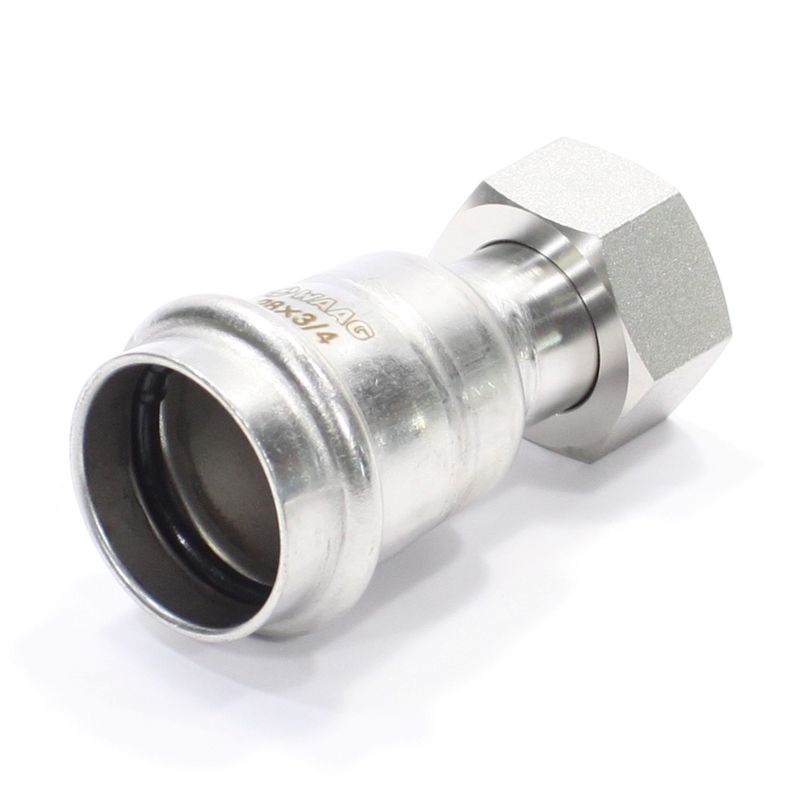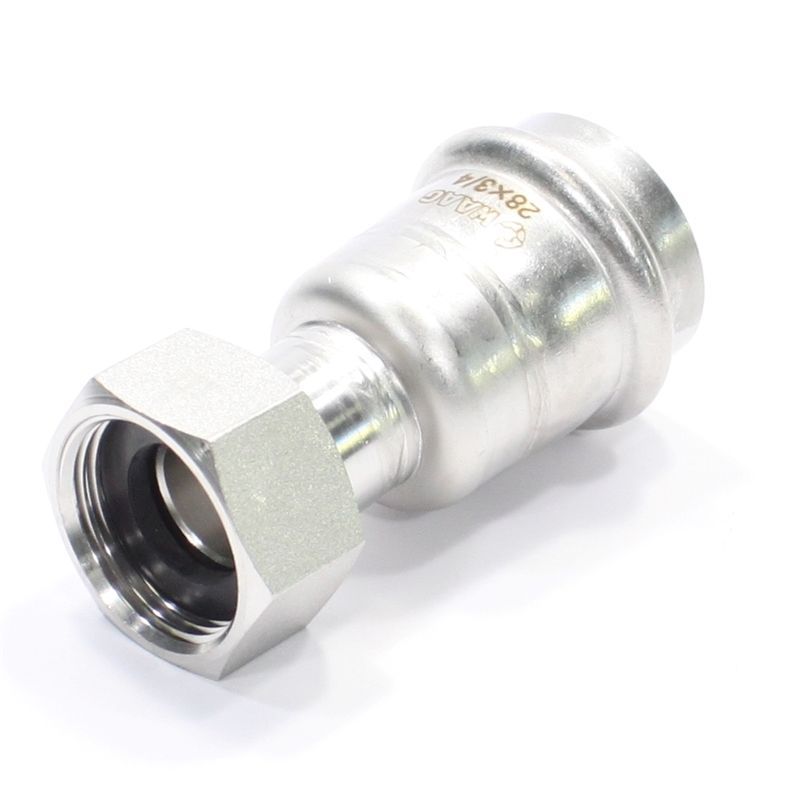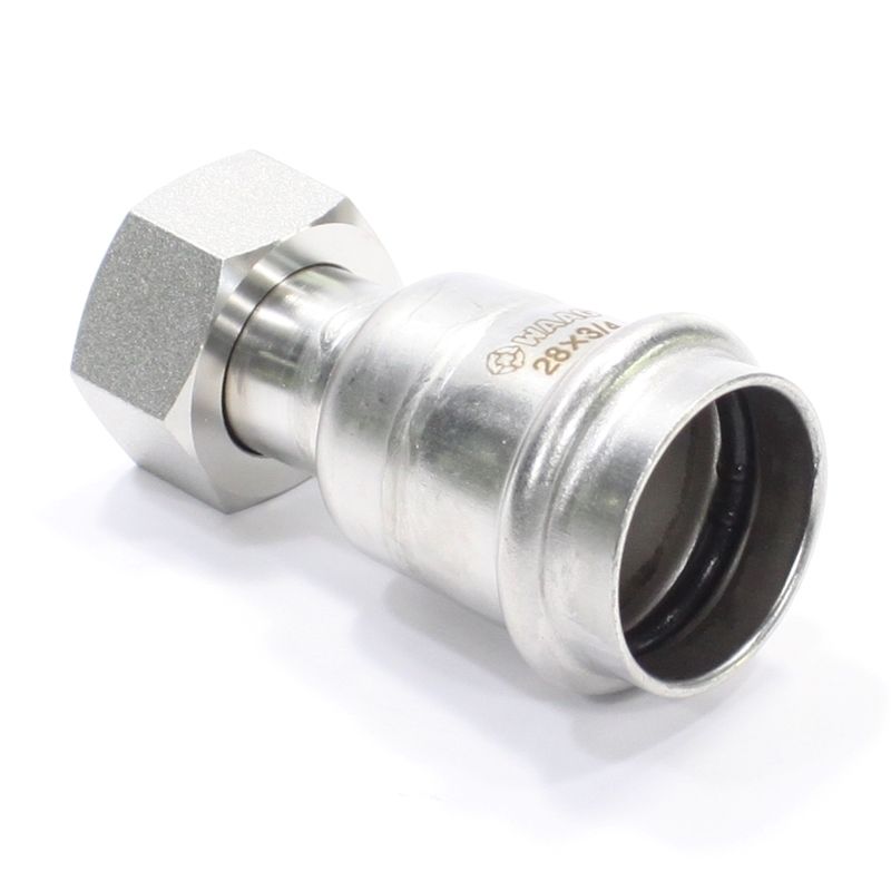 Пресс-фитинг из нержавеющей стали с накидной гайкой обеспечивает соединение тонкостенной стальной трубы c элементом системы, имеющим наружную резьбу. Область применения – трубопроводы водоснабжения, отопления, иные инженерные и технологические установки с рабочей температурой до 120 °С и давлением до 16 бар.