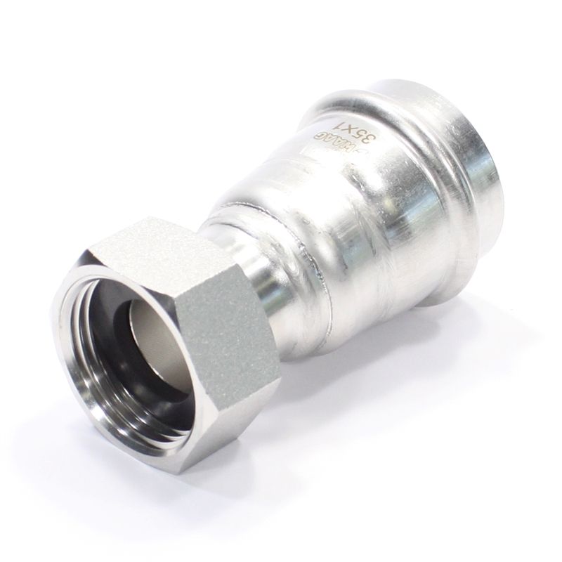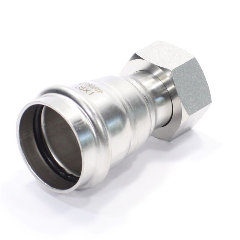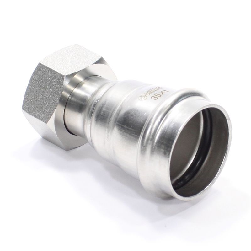 Пресс-фитинг из нержавеющей стали с накидной гайкой обеспечивает соединение тонкостенной стальной трубы c элементом системы, имеющим наружную резьбу. Область применения – трубопроводы водоснабжения, отопления, иные инженерные и технологические установки с рабочей температурой до 120 °С и давлением до 16 бар.