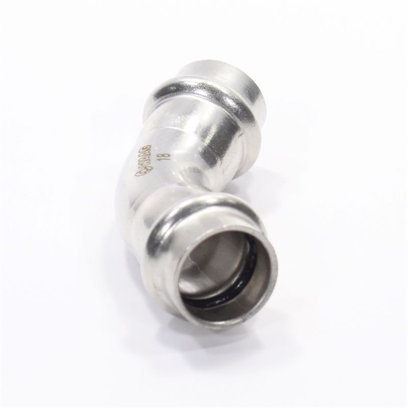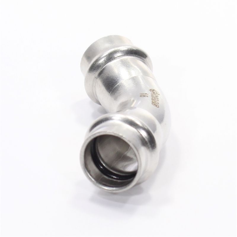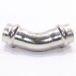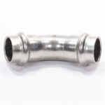 Двухраструбный пресс-угольник 45° из нержавеющей стали обеспечивает соединение тонкостенных стальных труб систем водоснабжения, отопления, иных инженерных и технологических установок с рабочей температурой до 120 °С и давлением до 16 бар.