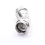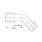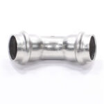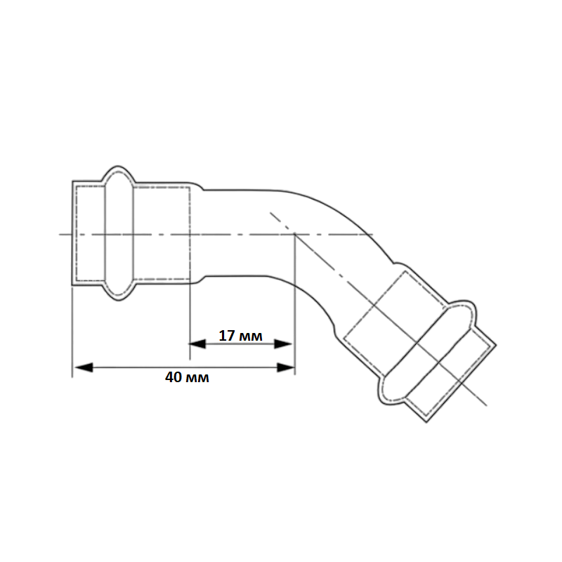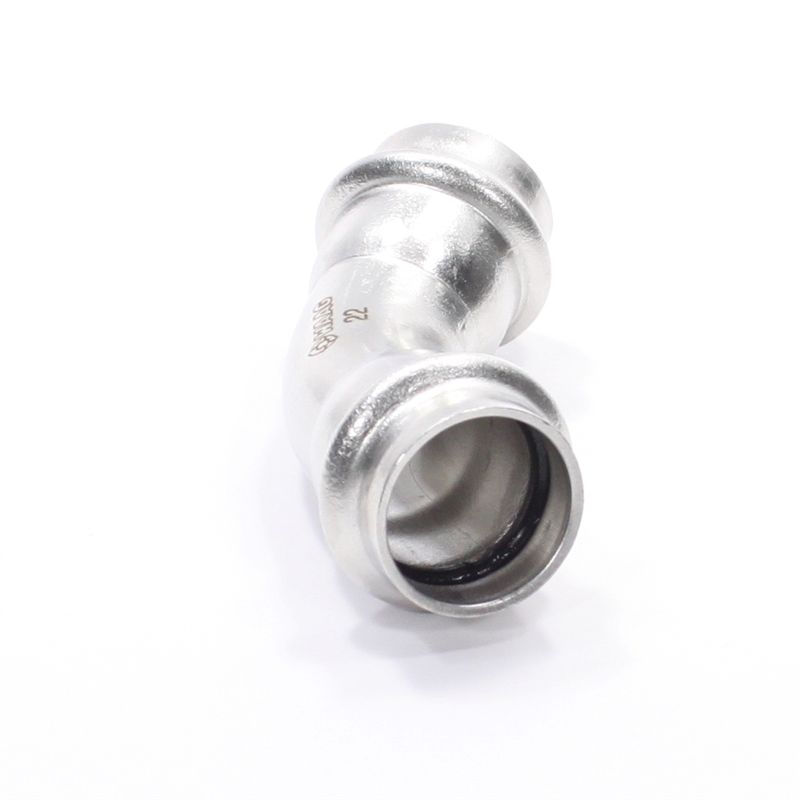 Двухраструбный пресс-угольник 45° из нержавеющей стали обеспечивает соединение тонкостенных стальных труб систем водоснабжения, отопления, иных инженерных и технологических установок с рабочей температурой до 120 °С и давлением до 16 бар.