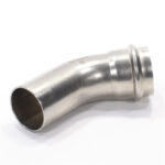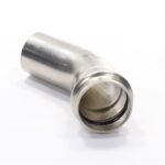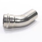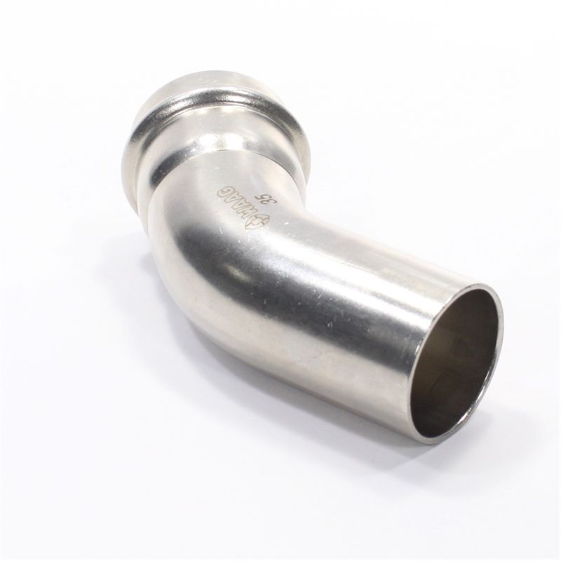 Однораструбный пресс-угольник 45° из нержавеющей стали обеспечивает соединение тонкостенных стальных труб систем водоснабжения, отопления, иных инженерных и технологических установок с рабочей температурой до 120 °С и давлением до 16 бар.