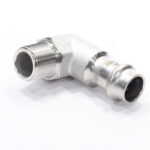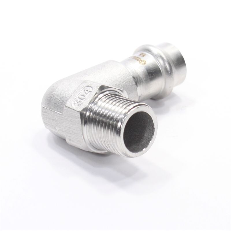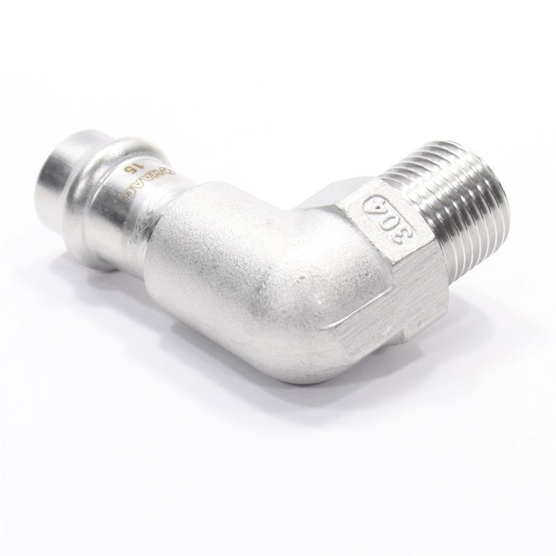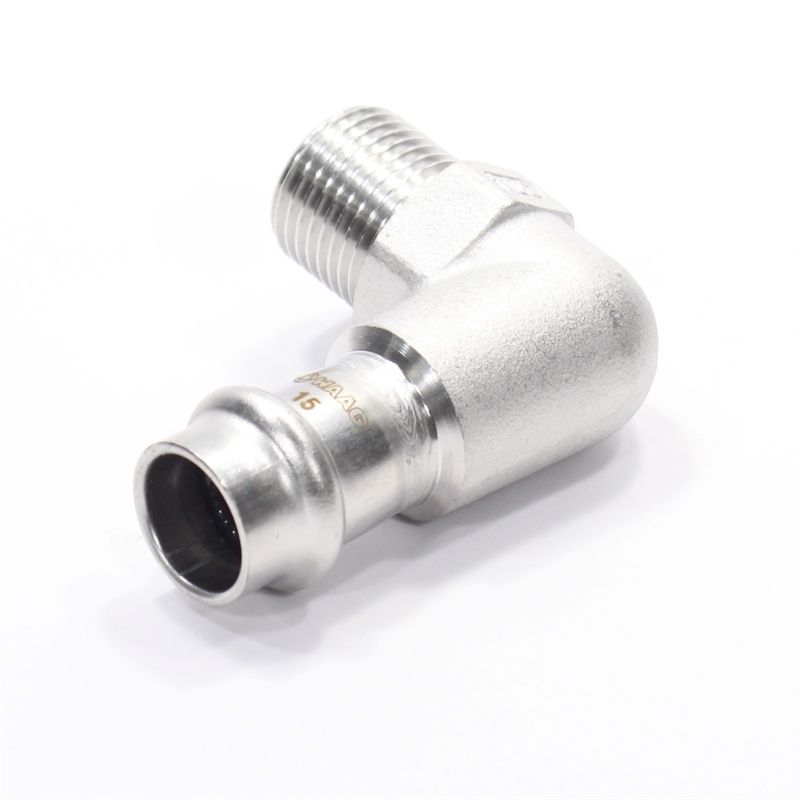 Пресс-угольник из нержавеющей стали с наружной резьбой обеспечивает соединение тонкостенной стальной трубы с резьбовым элементом монтируемой системы под углом 90°. Область применения – трубопроводы водоснабжения, отопления, иные инженерные и технологические установки с рабочей температурой до 120 °С и давлением до 16 бар.