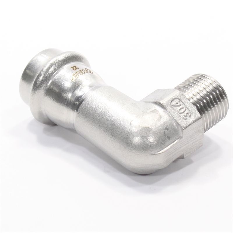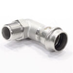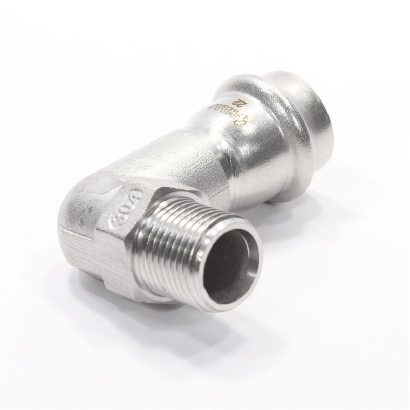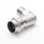 Пресс-угольник из нержавеющей стали с наружной резьбой обеспечивает соединение тонкостенной стальной трубы с резьбовым элементом монтируемой системы под углом 90°. Область применения – трубопроводы водоснабжения, отопления, иные инженерные и технологические установки с рабочей температурой до 120 °С и давлением до 16 бар.