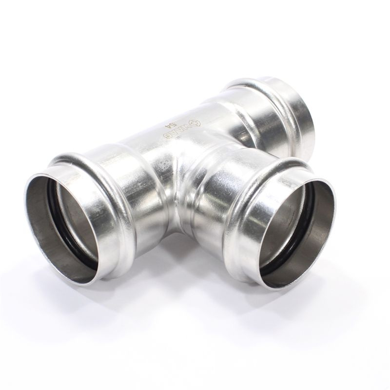 Достоинством бесштуцерных соединителей является малый коэффициент местного сопротивления (сужение канала практически отсутствует). Фитинг рассчитан на обжатие с помощью пресс-инструмента V-профиля.