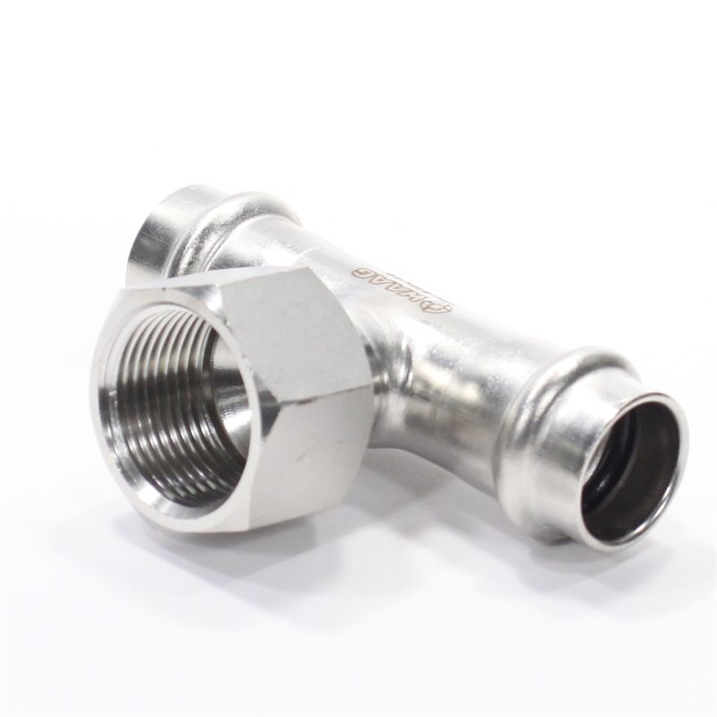 Пресс-тройник из нержавеющей стали с внутренней резьбой предназначен для соединения тонкостенных стальных труб с резьбовым элементом системы водоснабжения, отопления, других инженерных и технологических установок. Фитинг рассчитан на эксплуатацию при максимальной рабочей температуре 120 °С. Номинальное давление – 16 бар.
