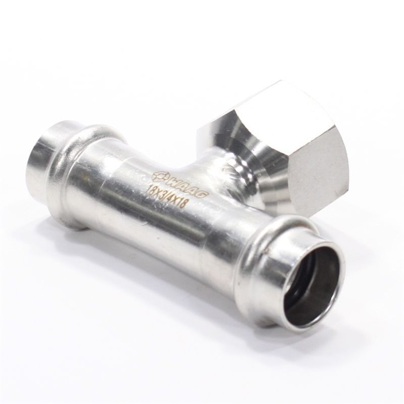 Двухраструбный тройник с внутренней резьбой изготовлен из стали AISI 304. Материал уплотнительных колец – эластомер EPDM. Уплотнение EPDM, установленное в пресс-фитинг WAAG оснащено уникальным индикатором прессования, которое показывает неопрессованное соединение. Такое соединение будет не герметично (протекать) под давлением от 0,1 до 6,0 бар, поэтому при установке необходимо убедиться, что труба полностью вставлена в фитинг.