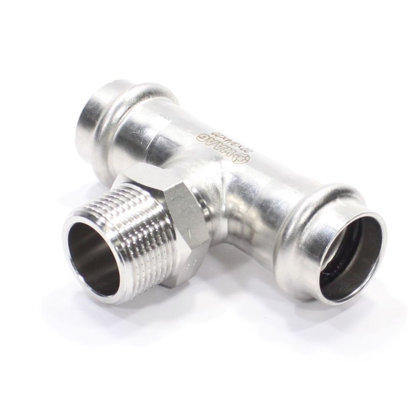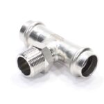 Пресс-тройник из нержавеющей стали с наружной резьбой предназначен для соединения тонкостенных стальных труб с резьбовым элементом системы водоснабжения, отопления, других инженерных и технологических установок. Фитинг рассчитан на эксплуатацию при максимальной рабочей температуре 120 °С. Номинальное давление – 16 бар.