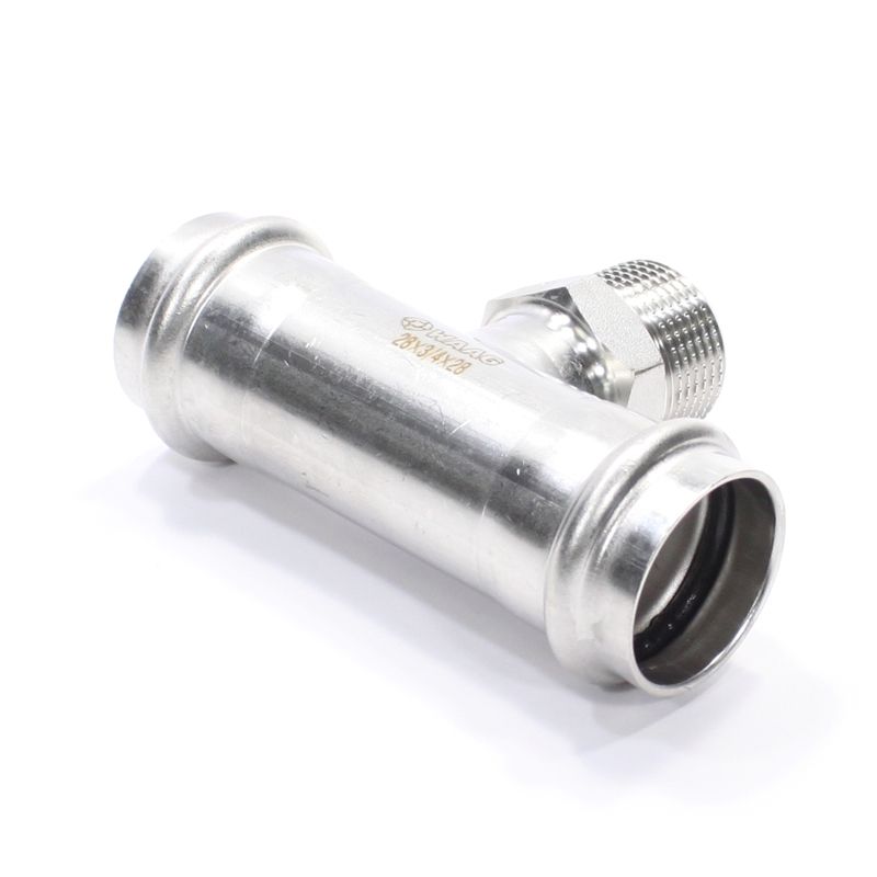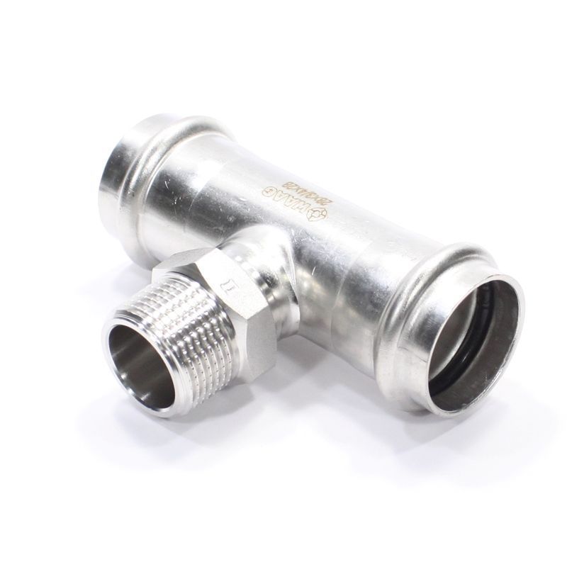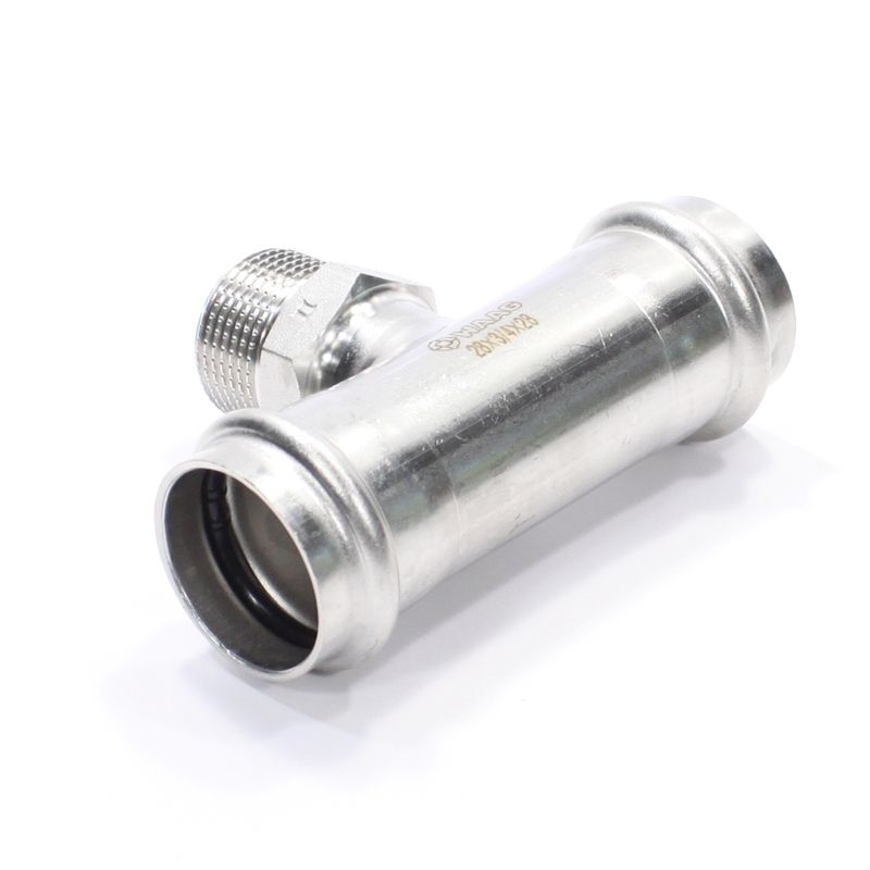 Пресс-тройник из нержавеющей стали с наружной резьбой предназначен для соединения тонкостенных стальных труб с резьбовым элементом системы водоснабжения, отопления, других инженерных и технологических установок. Фитинг рассчитан на эксплуатацию при максимальной рабочей температуре 120 °С. Номинальное давление – 16 бар.