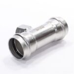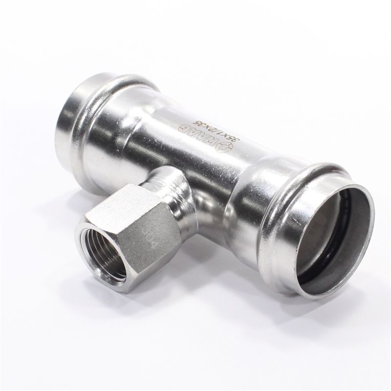 Двухраструбный тройник с внутренней резьбой изготовлен из стали AISI 304. Материал уплотнительных колец – эластомер EPDM. Уплотнение EPDM, установленное в пресс-фитинг WAAG оснащено уникальным индикатором прессования, которое показывает неопрессованное соединение. Такое соединение будет не герметично (протекать) под давлением от 0,1 до 6,0 бар, поэтому при установке необходимо убедиться, что труба полностью вставлена в фитинг.