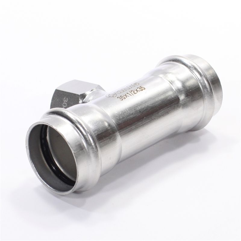 Пресс-тройник из нержавеющей стали с внутренней резьбой предназначен для соединения тонкостенных стальных труб с резьбовым элементом системы водоснабжения, отопления, других инженерных и технологических установок. Фитинг рассчитан на эксплуатацию при максимальной рабочей температуре 120 °С. Номинальное давление – 16 бар.