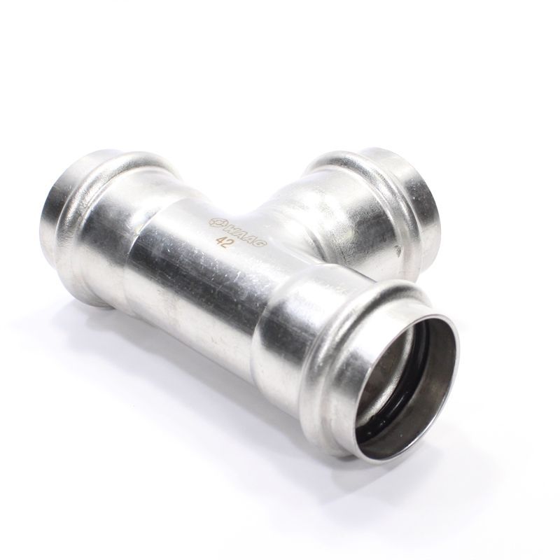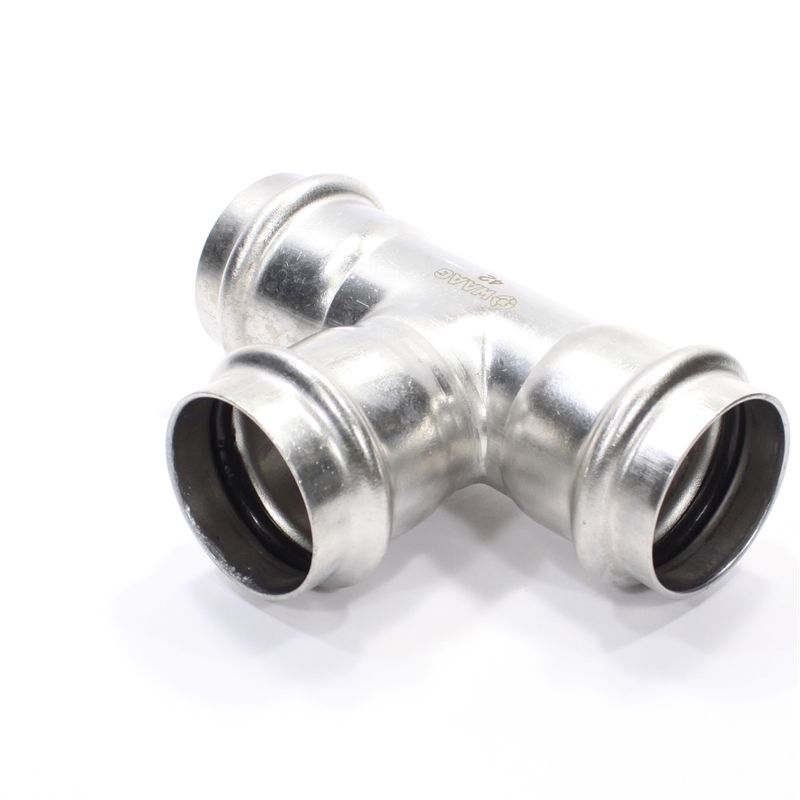Трехраструбный пресс-тройник из нержавеющей стали обеспечивает соединение трех тонкостенных стальных труб систем водоснабжения, отопления, иных инженерных и технологических установок с рабочей температурой до 120 °С и давлением до 16 бар.