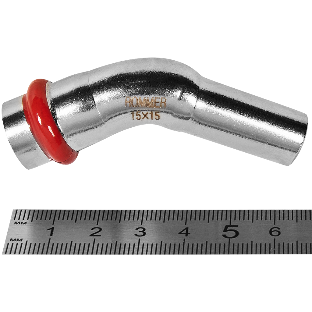 RSS-0004-000015 ROMMER Угольник однораструбный 45° ВПр-НПр, 15, из нержавеющей стали прессовой