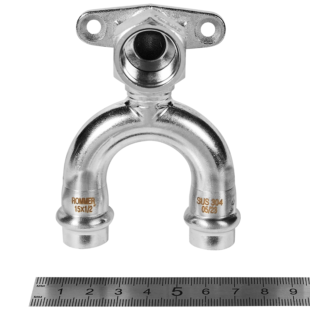 ROMMER Угольник проходной настенный с креплением ВПр-ВР, 15х1/2, из нержавеющей стали прессовой RSS-0012-001512