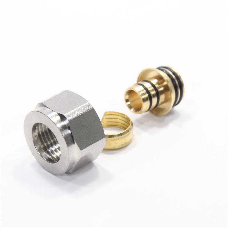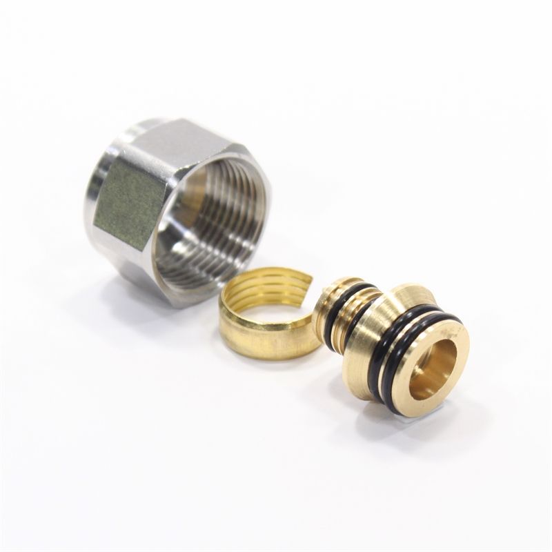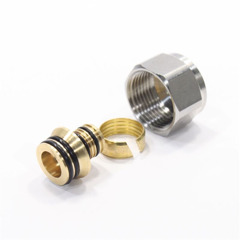 Для подключения труб 17 x 2,0 мм состоит из упорной втулки, разрезного обжимного кольца и накидной гайки.