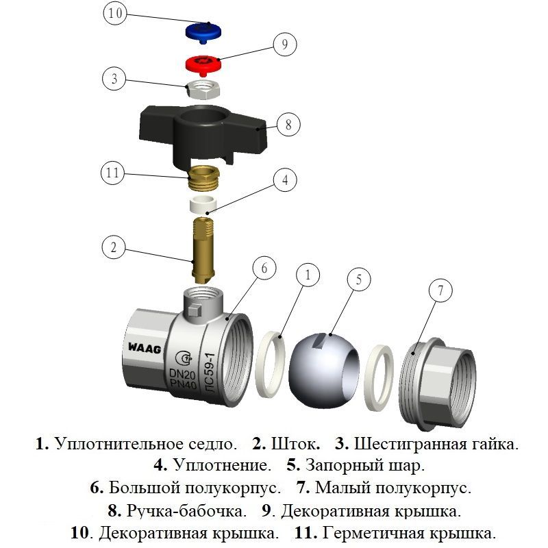 Полнопроходной запорный шаровой кран WAAG изготовлен из латуни CW617N. Никелированное покрытие защищает кран от коррозийных веществ. Кран имеет ручку типа «бабочка» из алюминиевого сплава.