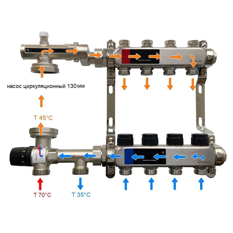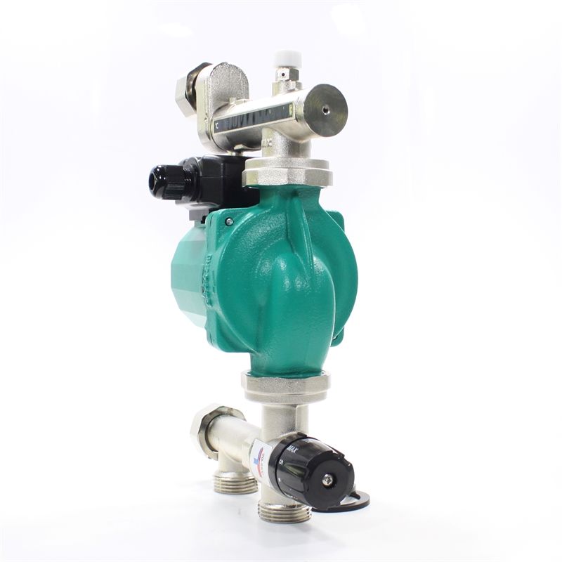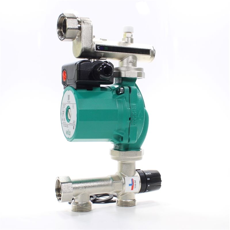 Узел смешения для обеспечения регулировки и циркуляции смешиваемого теплоносителя. Обеспечивает циркуляцию теплоносителя, поступающего из первичного контура, и поддержание постоянной температуры в соответствии с заданным значением (фиксированной точкой) с помощью смесительного клапана с термостатическим элементом.